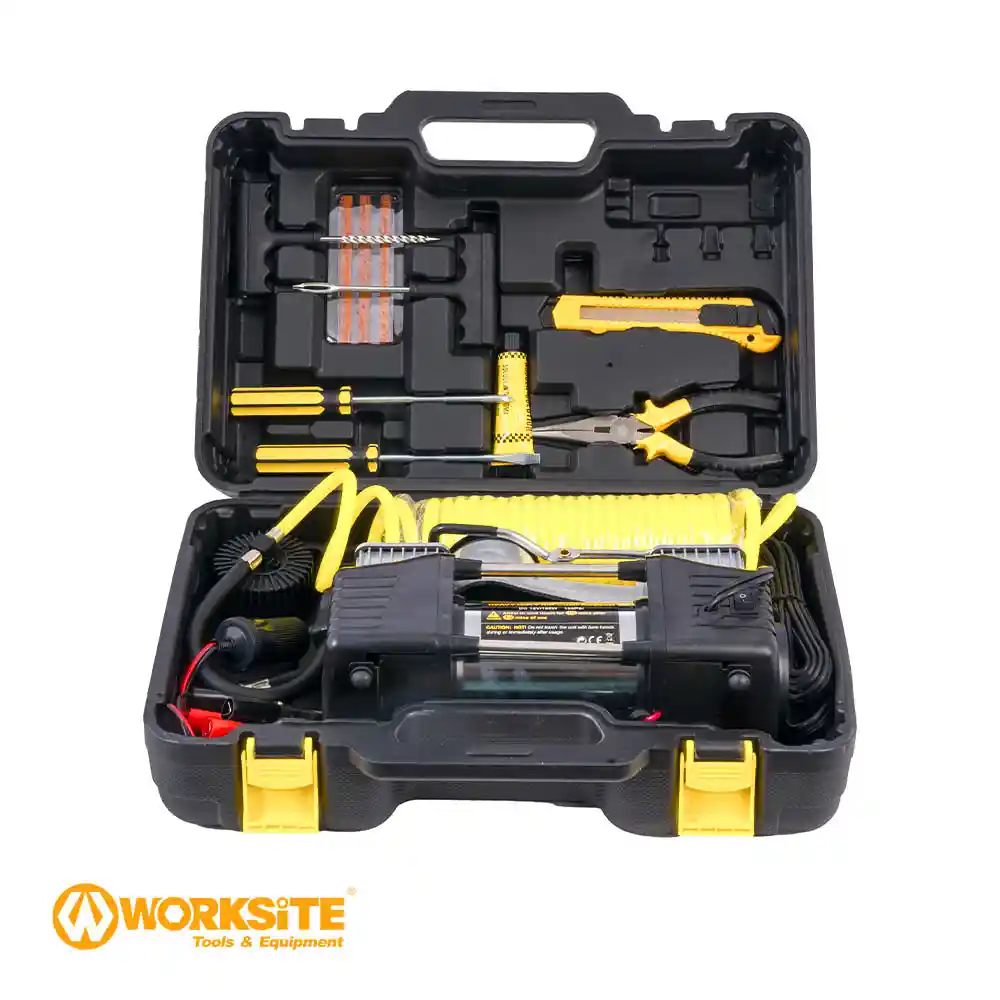 - اقلام همراه و کیف متعلقات : شيلنگ فنري 5 متري، دم باريك ، انبر اتصال ، كاتر ، پيچ گوشتی و لوازم کامل پنچر گیری